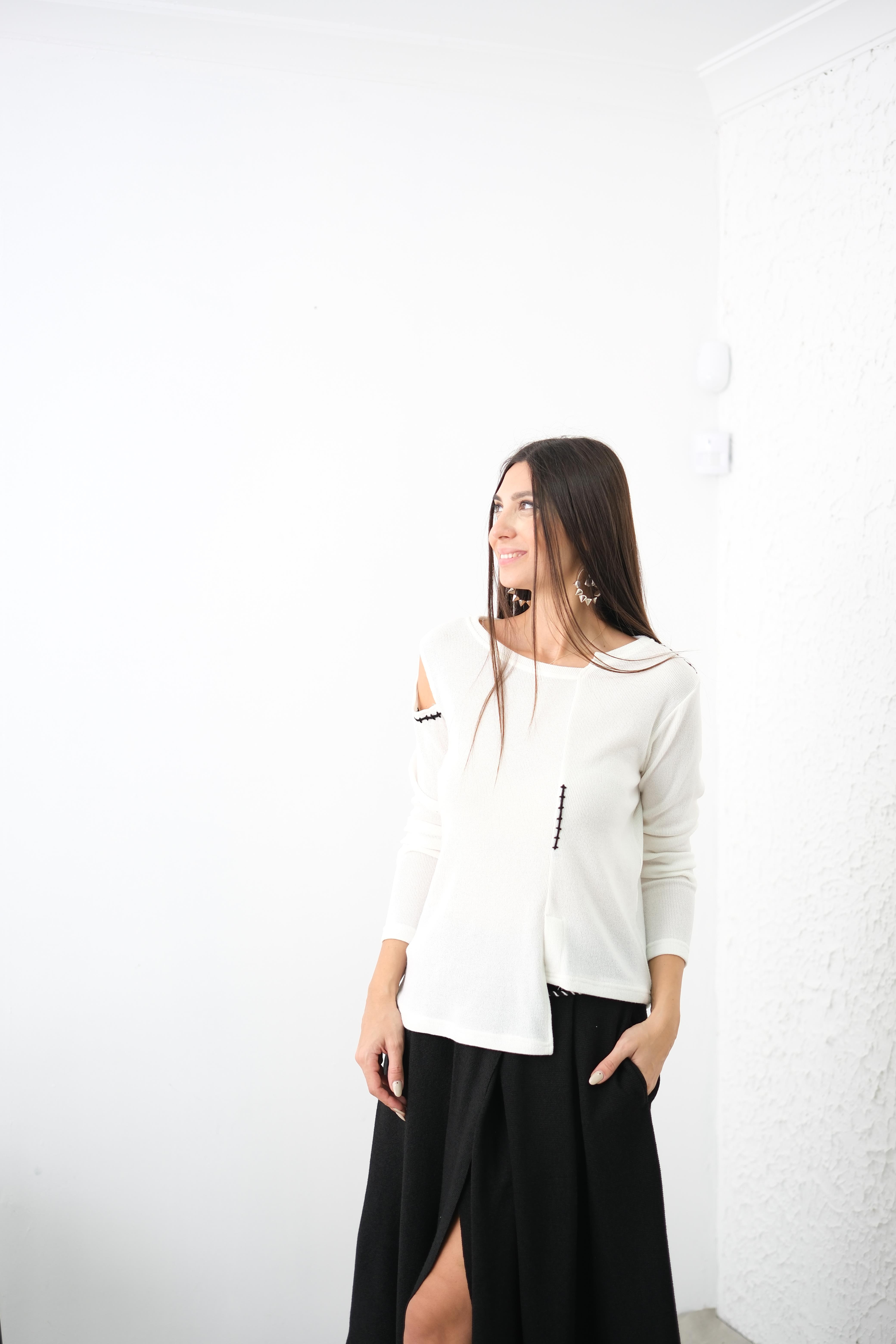 Modelin Ölçüleri: 1.84/70 kg. Mankenin üzerindeki M beden. Kalıp: Normal Boy/Ölçü: Uzun Tüm boy ölçüsü: 65 cm Göğüs ölçüsü: 55 cm (Koltuk altından koltuk altına) Kumaş: %96 Pes %4 Spandex